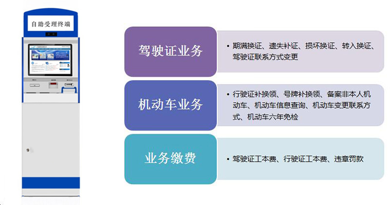 本产品采用优质工艺,集人脸识别、指纹识别、物联网、深度学习、计算机通信技术及数据库技术为一体,实现机动车、驾驶证、交通违法等车驾管业务的全流程智能化、自助化。产品部署灵活,真正实现“互联网+政务服务”为重点的利民便民措施。